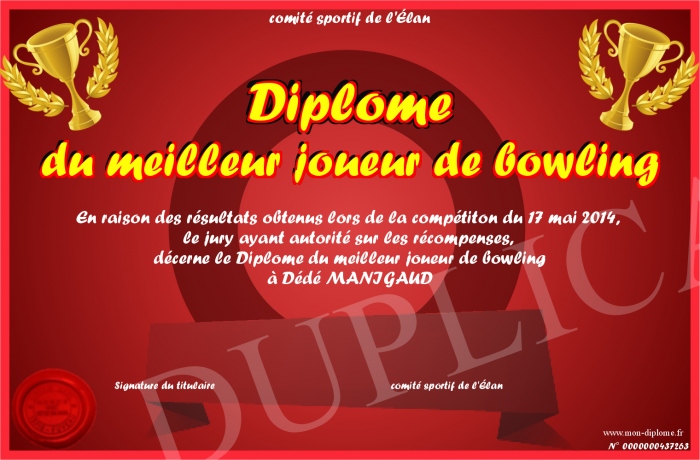 Envoyez par email votre Diplôme du meilleur joueur de bowling personalisé