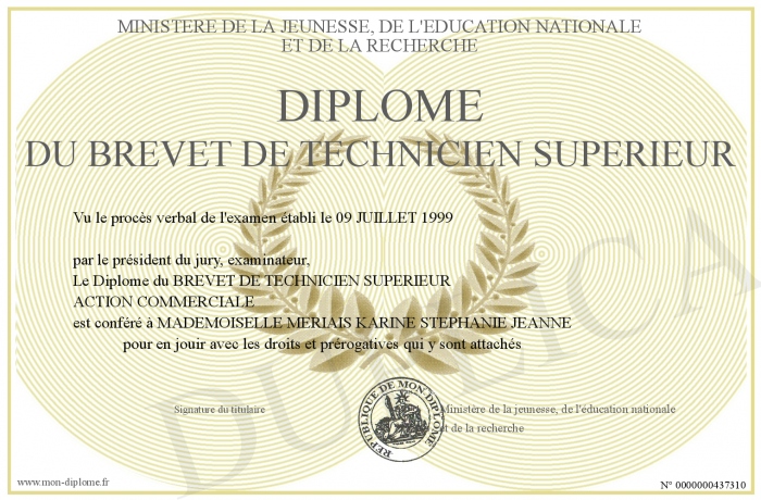 Envoyez par email votre Diplome du BREVET DE TECHNICIEN SUPERIEUR personalisé