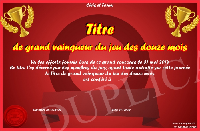 Envoyez par email votre Titre de grand vainqueur du jeu des douze mois personalisé