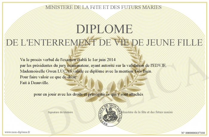 Envoyez par email votre Diplôme de l'enterrement de vie de jeune fille personalisé