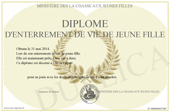 Envoyez par email votre Diplôme d'enterrement de vie de jeune fille personalisé