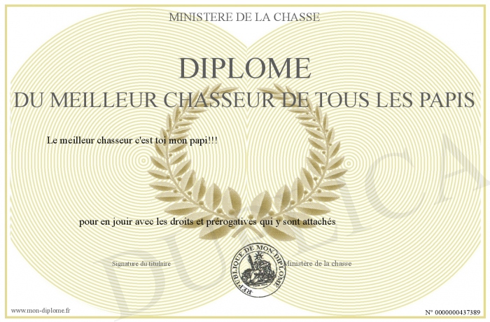 Envoyez par email votre Diplôme du meilleur chasseur de tous les papis personalisé
