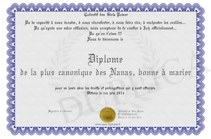 Envoyez par email votre Diplôme de la plus canonique des Nanas, bonne à marier personalisé