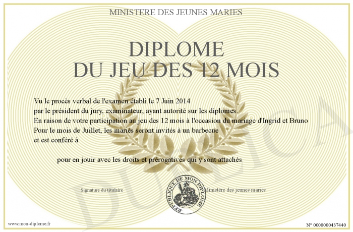 Envoyez par email votre Diplôme du jeu des 12 mois personalisé