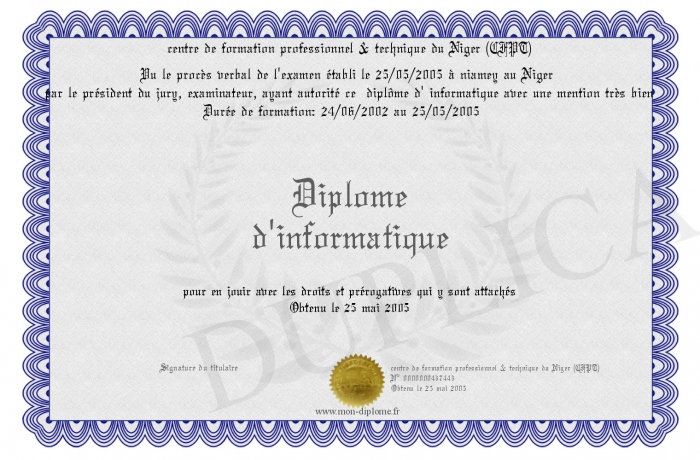Envoyez par email votre Diplome d'informatique personalisé