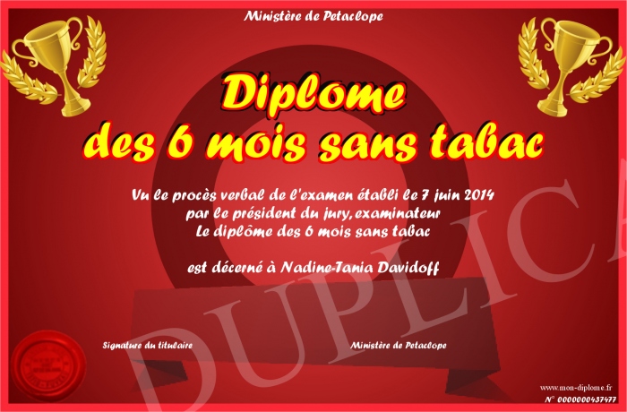 Envoyez par email votre Diplôme des 6 mois sans tabac personalisé