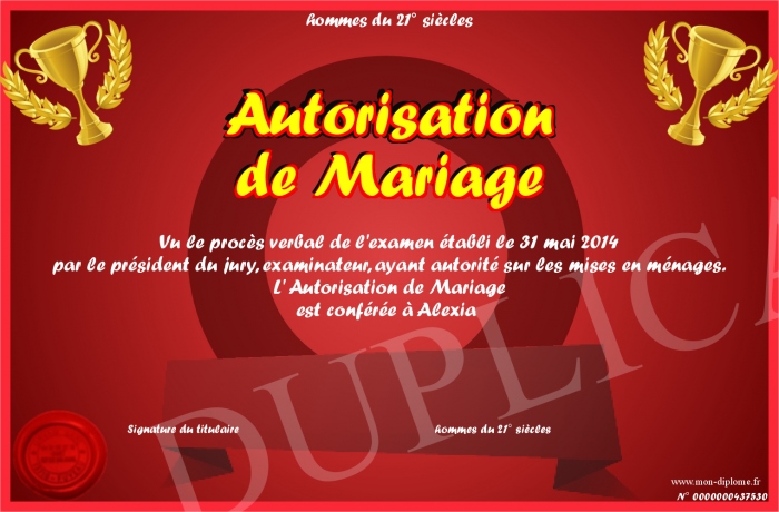 Envoyez par email votre Autorisation de Mariage personalisé
