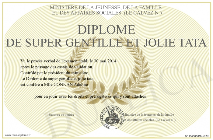 Envoyez par email votre Diplôme de super gentille et jolie tata personalisé