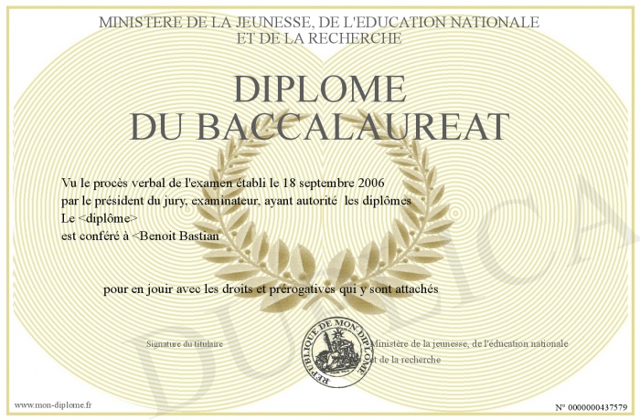Envoyez par email votre Diplome du baccalaureat personalisé