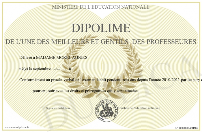 Envoyez par email votre DIPOLIME DE L'UNE DES MEILLEURS ET GENTILS DES PROFESSEURES personalisé