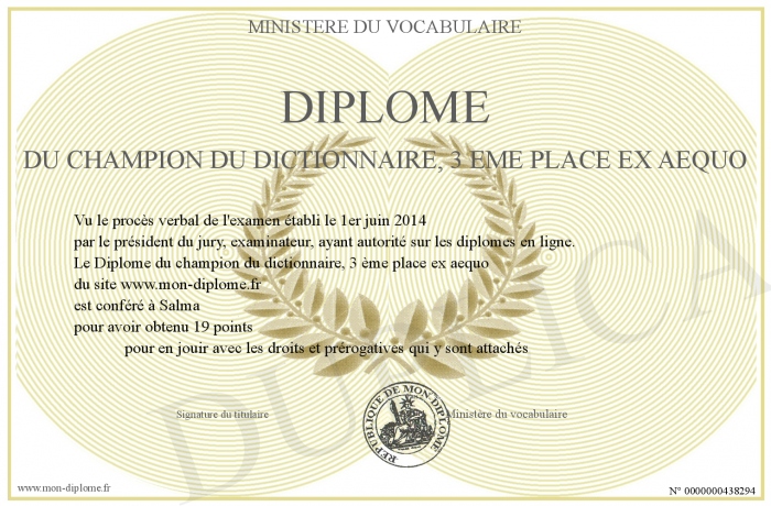Envoyez par email votre Diplôme du champion du dictionnaire, 3 ème place ex aequo personalisé