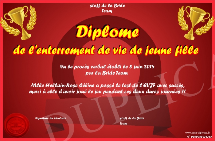 Envoyez par email votre Diplôme de l'enterrement de vie de jeune fille personalisé