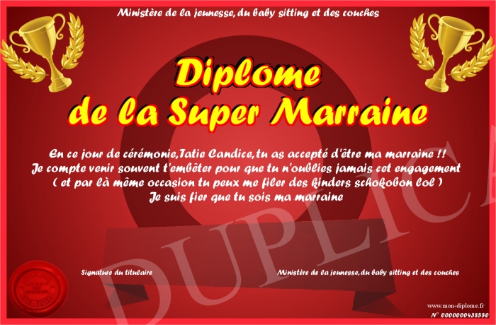 Envoyez par email votre Diplôme de la Super Marraine personalisé