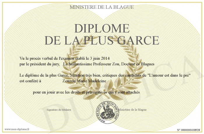 Envoyez par email votre Diplôme de la plus Garce personalisé