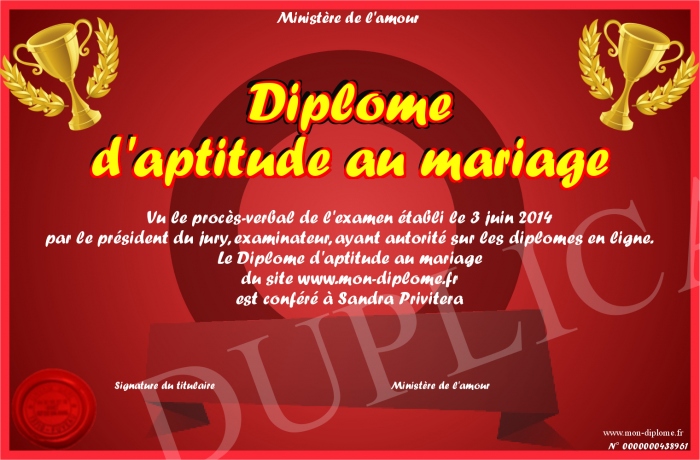 Envoyez par email votre Diplome d'aptitude au mariage personalisé