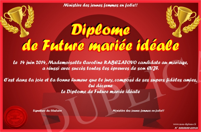 Envoyez par email votre Diplôme de Future mariée idéale personalisé