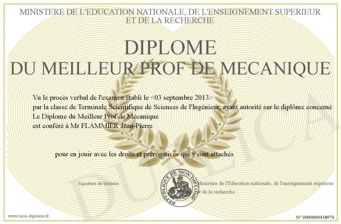 Envoyez par email votre Diplôme du Meilleur Prof de Mécanique personalisé