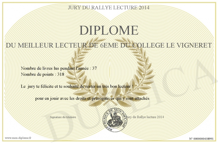 Envoyez par email votre Diplôme du meilleur lecteur de 6ème du Collège Le Vigneret personalisé