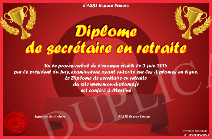 Envoyez par email votre Diplôme de secrétaire en retraite personalisé
