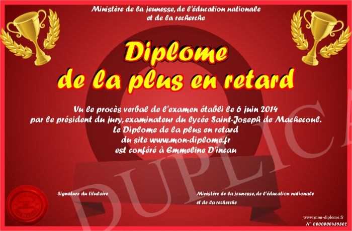 Envoyez par email votre Diplôme de la plus en retard personalisé