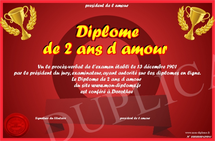 Envoyez par email votre Diplôme de 2 ans d amour personalisé