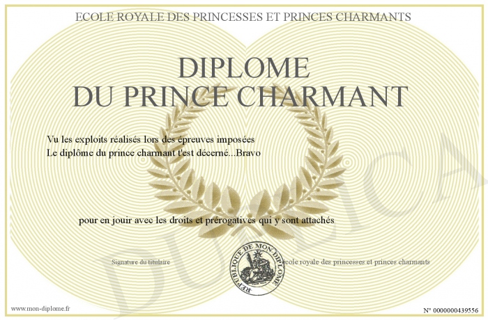 Envoyez par email votre Diplôme du prince charmant personalisé
