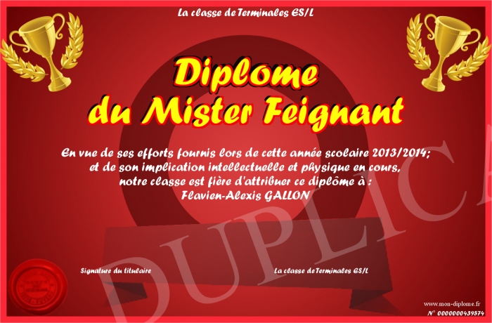 Envoyez par email votre Diplôme du Mister Feignant personalisé