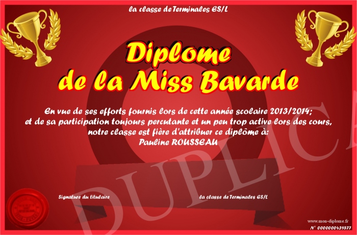 Envoyez par email votre Diplôme de la Miss Bavarde personalisé