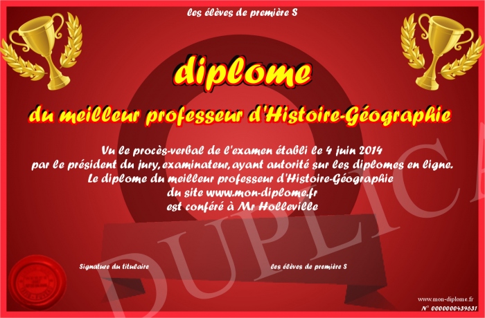Envoyez par email votre diplôme du meilleur professeur d'Histoire-Géographie personalisé