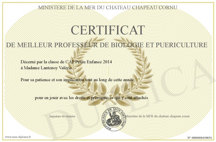 Envoyez par email votre Certificat de meilleur professeur de biologie et puériculture personalisé