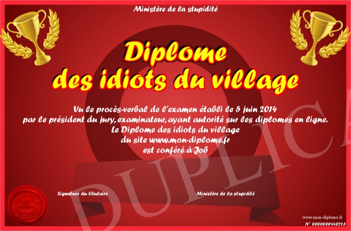 Envoyez par email votre Diplôme des idiots du village personalisé