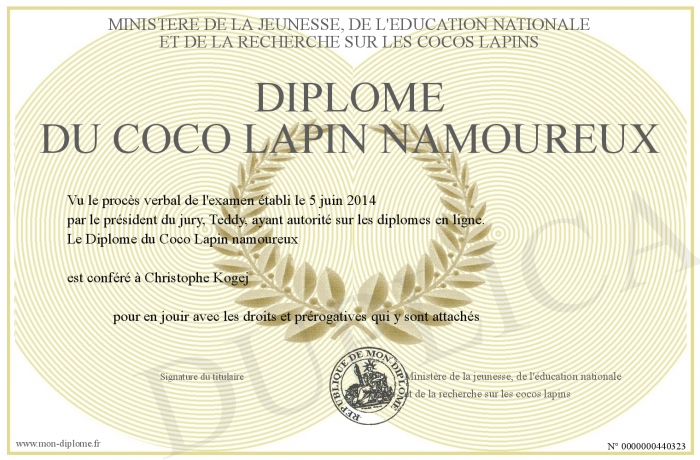 Envoyez par email votre Diplôme du Coco Lapin namoureux personalisé