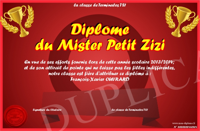 Envoyez par email votre Diplôme du Mister Petit Zizi personalisé