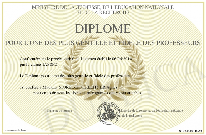 Envoyez par email votre Diplôme pour l'une des plus gentille et fidèle des professeurs personalisé
