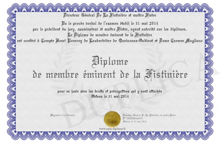 Envoyez par email votre Diplôme de membre éminent de la Fistinière personalisé