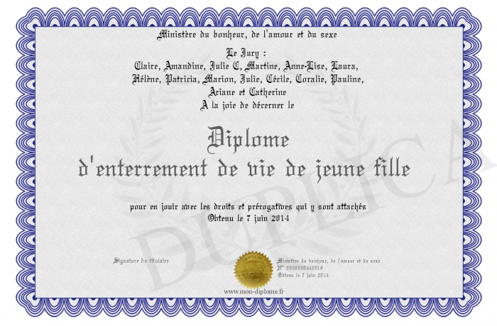 Envoyez par email votre Diplôme d'enterrement de vie de jeune fille personalisé