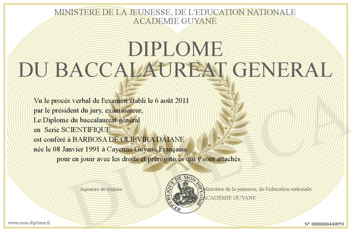 Envoyez par email votre Diplôme du baccalaureat général personalisé