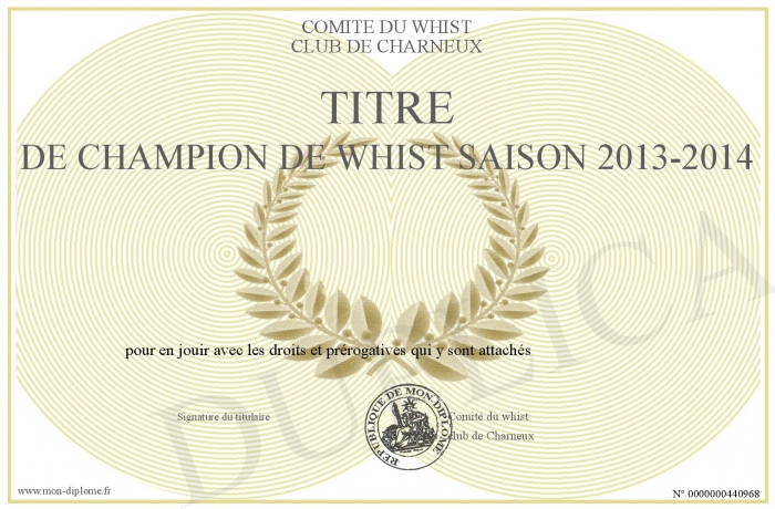 Envoyez par email votre titre de champion de whist saison 2013-2014 personalisé
