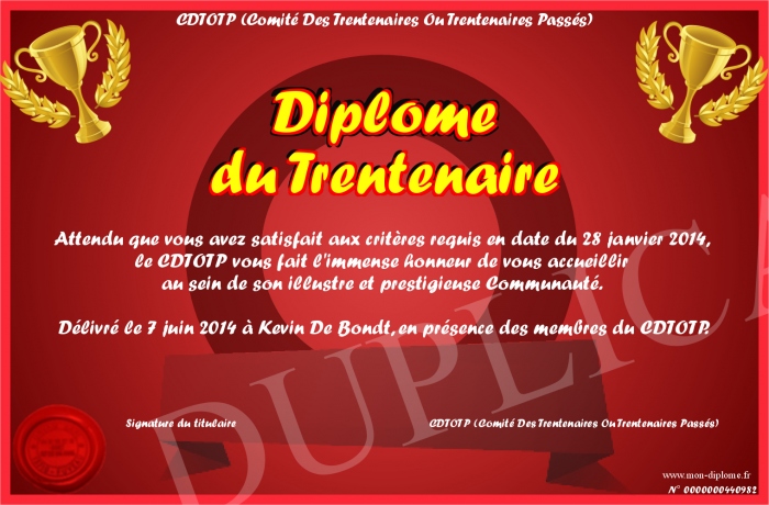 Envoyez par email votre Diplôme du Trentenaire personalisé