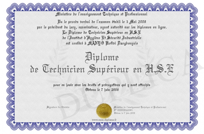 Envoyez par email votre Diplome de Technicien Supérieur en H.S.E personalisé