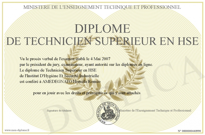 Envoyez par email votre Diplome de Technicien Supérieur en HSE personalisé