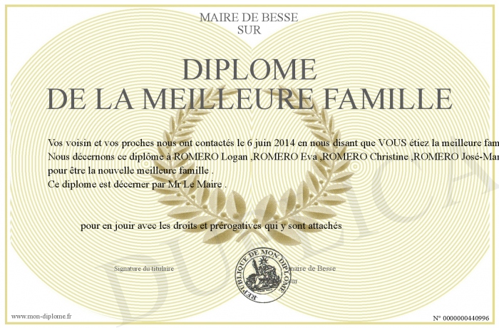 Envoyez par email votre Diplôme de la meilleure famille personalisé