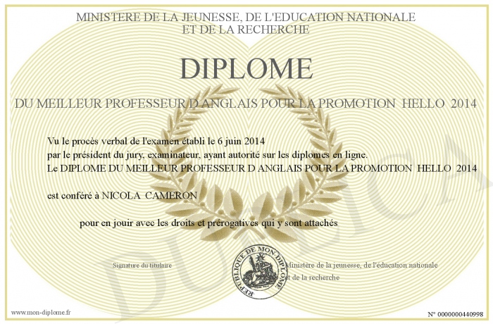 Envoyez par email votre DIPLOME DU MEILLEUR PROFESSEUR D ANGLAIS POUR LA PROMOTION HELLO 2014 personalisé