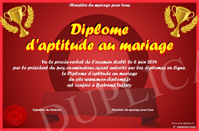 Envoyez par email votre Diplome d'aptitude au mariage personalisé