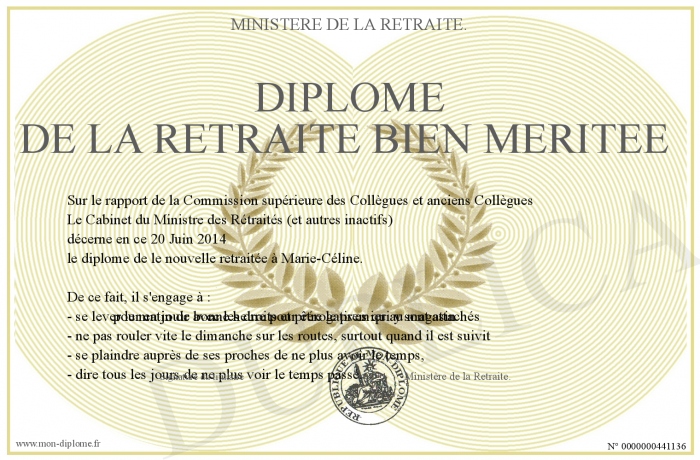 Envoyez par email votre Diplôme de la RETRAITE BIEN MERITEE personalisé