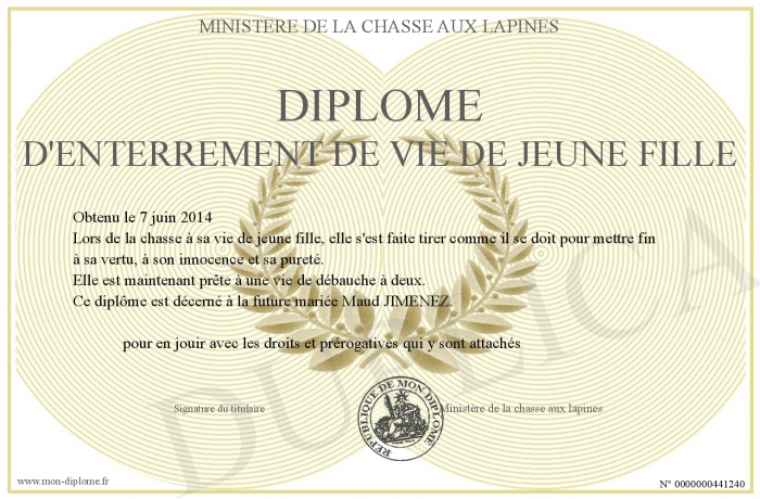 Envoyez par email votre Diplôme d'enterrement de vie de jeune fille personalisé