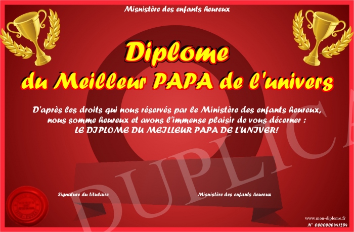 Envoyez par email votre Diplome du Meilleur PAPA de l'univers personalisé