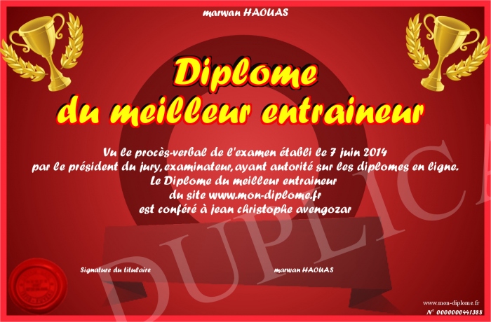 Envoyez par email votre Diplôme du meilleur entraineur personalisé