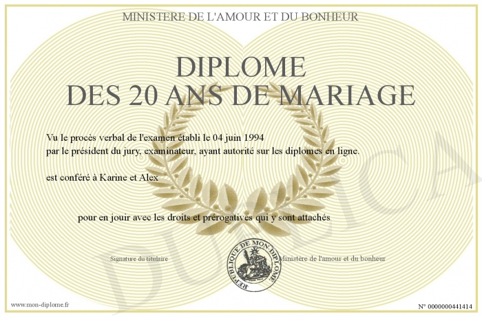Envoyez par email votre Diplôme des 20 ans de mariage personalisé