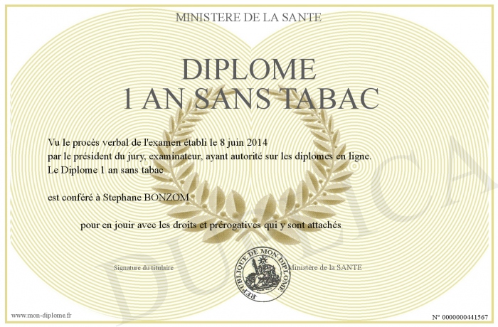 Envoyez par email votre Diplôme 1 an sans tabac personalisé